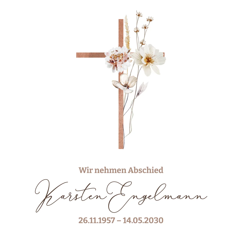 Das Totenkreuz umrankt von zarten Blumen segnet das Ende der verstorbenen Person. Laden Sie stilvoll zum schweren letzten Gang, die Trauerfeier mit Urnenbeisetzung ein. Bitten Sie im Anschluss zu einem gemeinsamen Beisammensein und Erinnern. Innen ist Platz für ein schönes Erinnerungsfoto.
