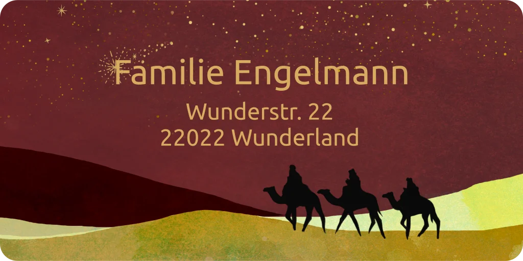 Die passenden Adressaufkleber für deine Weihnachtskarten Drei Könige im Abendbrot der Wüste mit Sternenhimmel. Besonders festlich und perfekt, wenn du deinen Namen und deine Anschrift nicht händisch auf die Briefumschläge schreiben möchtest. Wähle eine Schriftart und spare Zeit beim Versand.