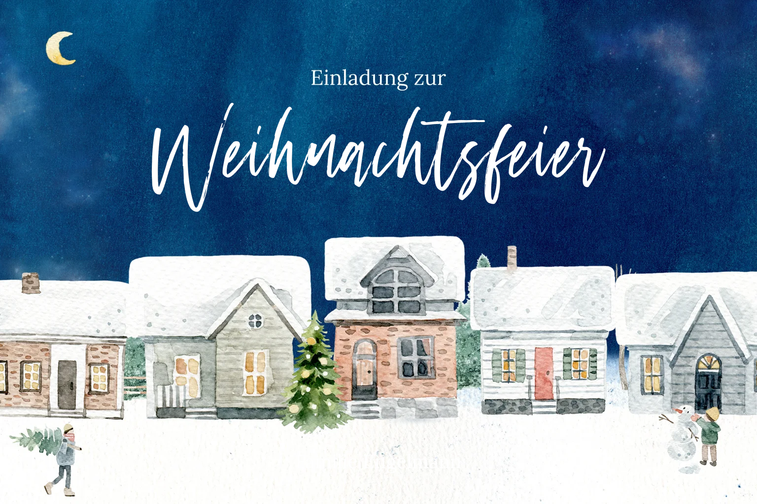 Ein winterliches Dorf wie auf der Karte stimmt die Weihnachtszeit ein. Lade deine Familie und Freude mit dieser Karte zur Weihnachtsfeier ein und genießt die besinnliche Zeit.