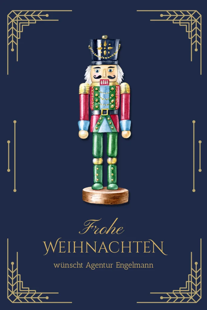 Wir alle kennen Ihnen - der Nussknacker! Ein Symbol für Weihnachten und somit die perfekte Karte, um Ihren Partnern frohe Weihnachten zu wünschen. Der Nussknacker erstrahlt auf einen dunkelblauen Untergrund mit verzierter Umrandung.