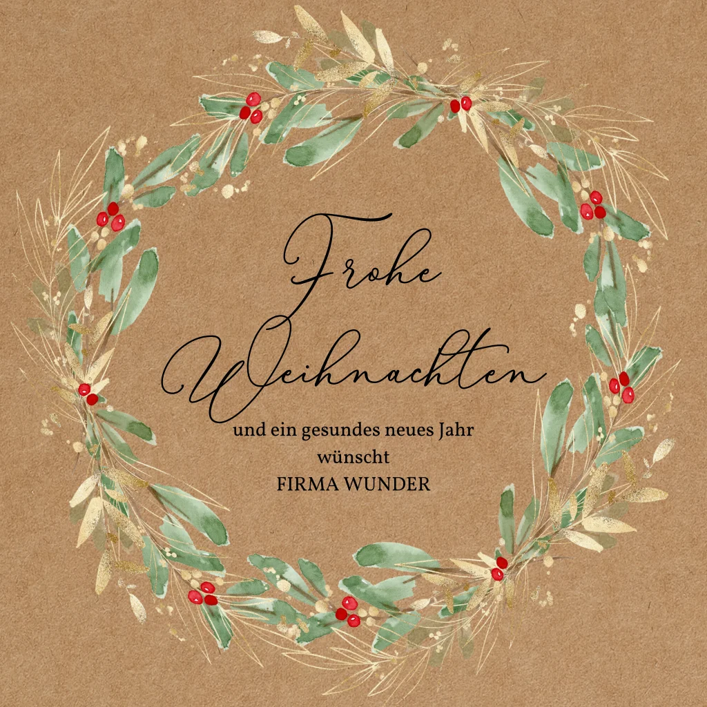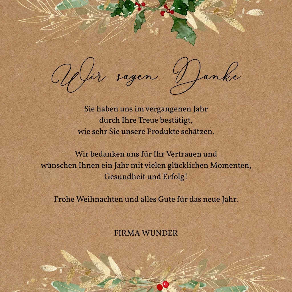 Ein blühender Lorbeerkranz mit Zweigen in Goldoptik auf rustikaler Kraftpapieroptik umrundet Ihren weihnachtlichen Gruß zum Jahresende und sorgt dafür, dass Sie sich stilvoll bei Ihren Geschäftspartnern für das vergangene Jahr bedanken und sich auf das Nächste freuen können.