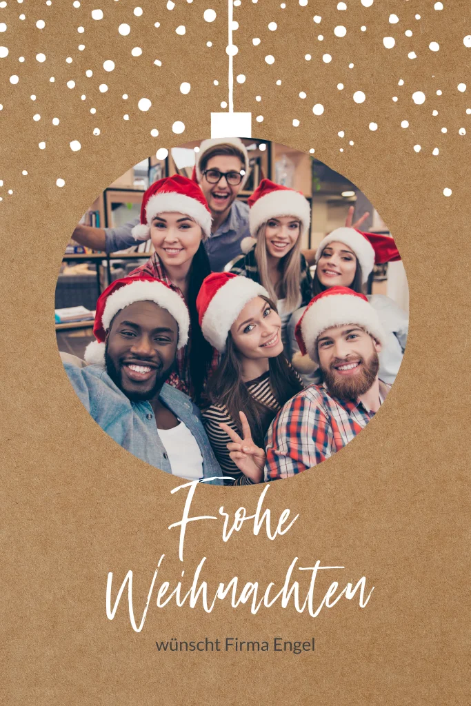 Sagen Sie Danke an Ihre Geschäftspartner für dieses Jahr. Höhen und Tiefen wurden gemeinsam beschritten und die Freude auf ein neues gutes Jahr steht schon in den Startlöchern. Mit dieser Karte bei der der Unterton in Kraftpapier-Optik ist, können Sie in der runden Weihnachtskugel ein Foto oder Firmenlogo hochladen.
