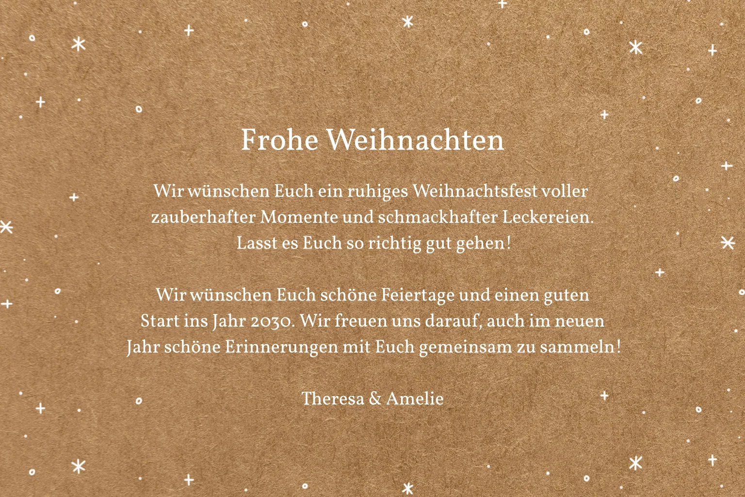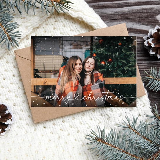 Merry christmas & a happy new year - versende mit dieser bezaubernden Weihnachtskarte herzliche Grüße in Kraftpapieroptik mit kleinem Schneegestöber zum Fest. Die malerischen Schriftzüge versprühen Eleganz und eine winterliche Atmosphäre, abgerundet mit einem bezaubernden Winterfoto.