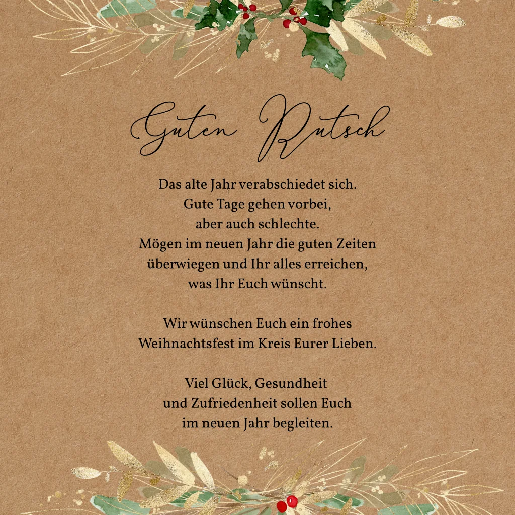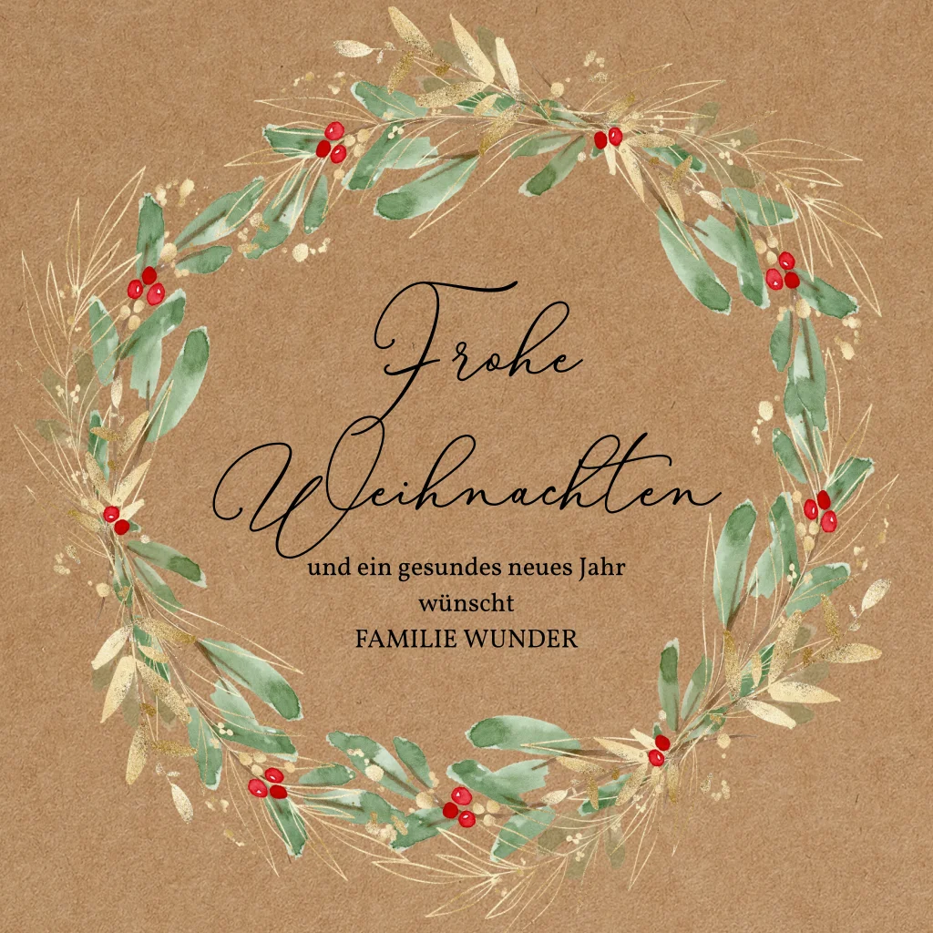 Der blühende Lorbeerkranz mit Zweigen in Goldoptik auf der rustikalen Kraftpapieroptik umrundet deinen weihnachtlichen Gruß zum Jahresende. Verzaubere deine Liebsten mit deinem Lieblingsfoto im Inneren und wünsche ihnen tolle Feiertage im Kreise ihrer Vertrauten.