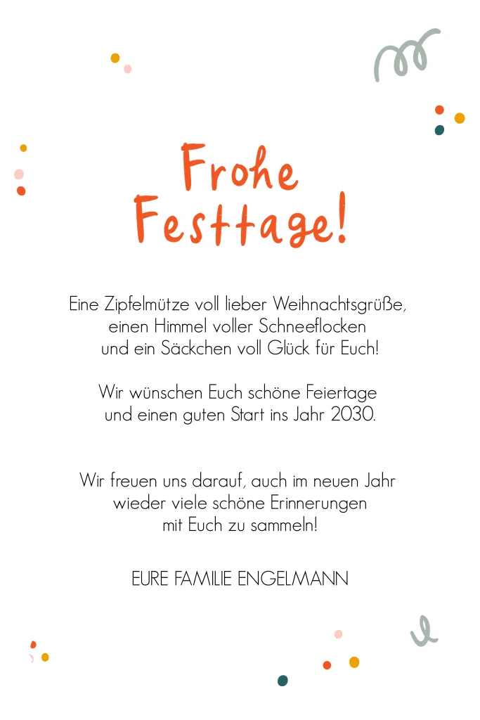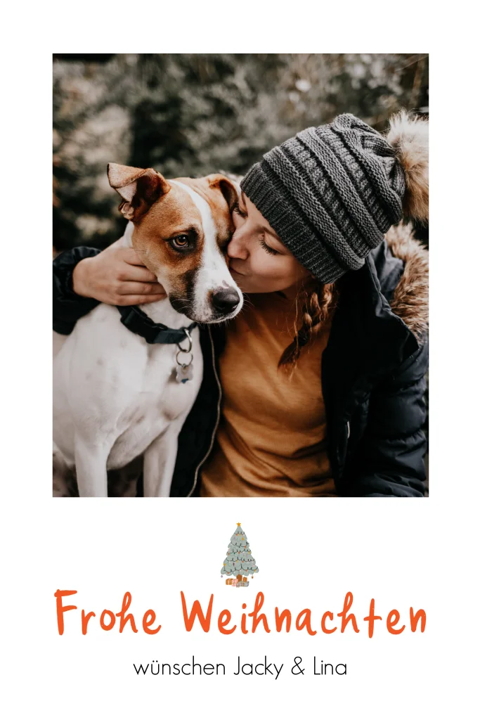Dein Lieblingsfoto des vergangenen Jahres, darunter ein kleiner Tannenbaum und der Schriftzug Frohe Weihnachten. Versende einen liebevollen Tannenbaumgruß und wünsche innen frohe Festtage mit einem kleinen Konfettiregen. Freu dich auf das herannahende Jahr.
